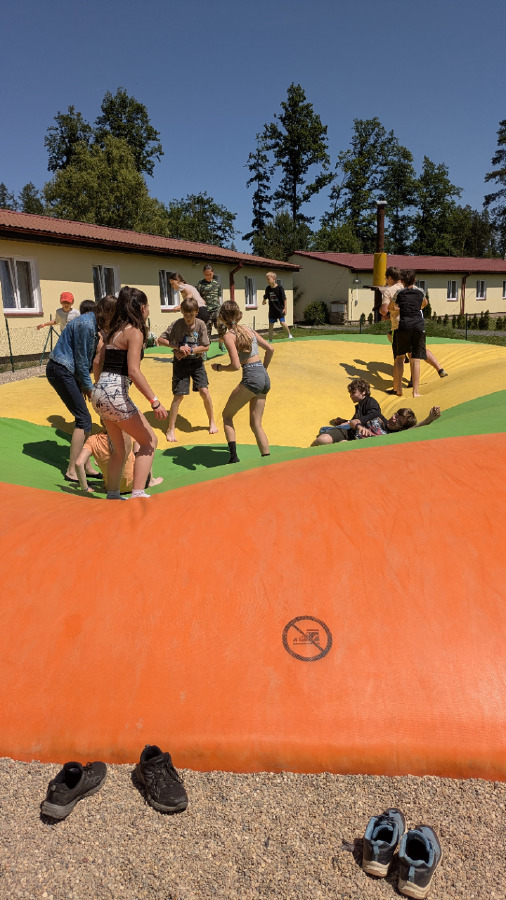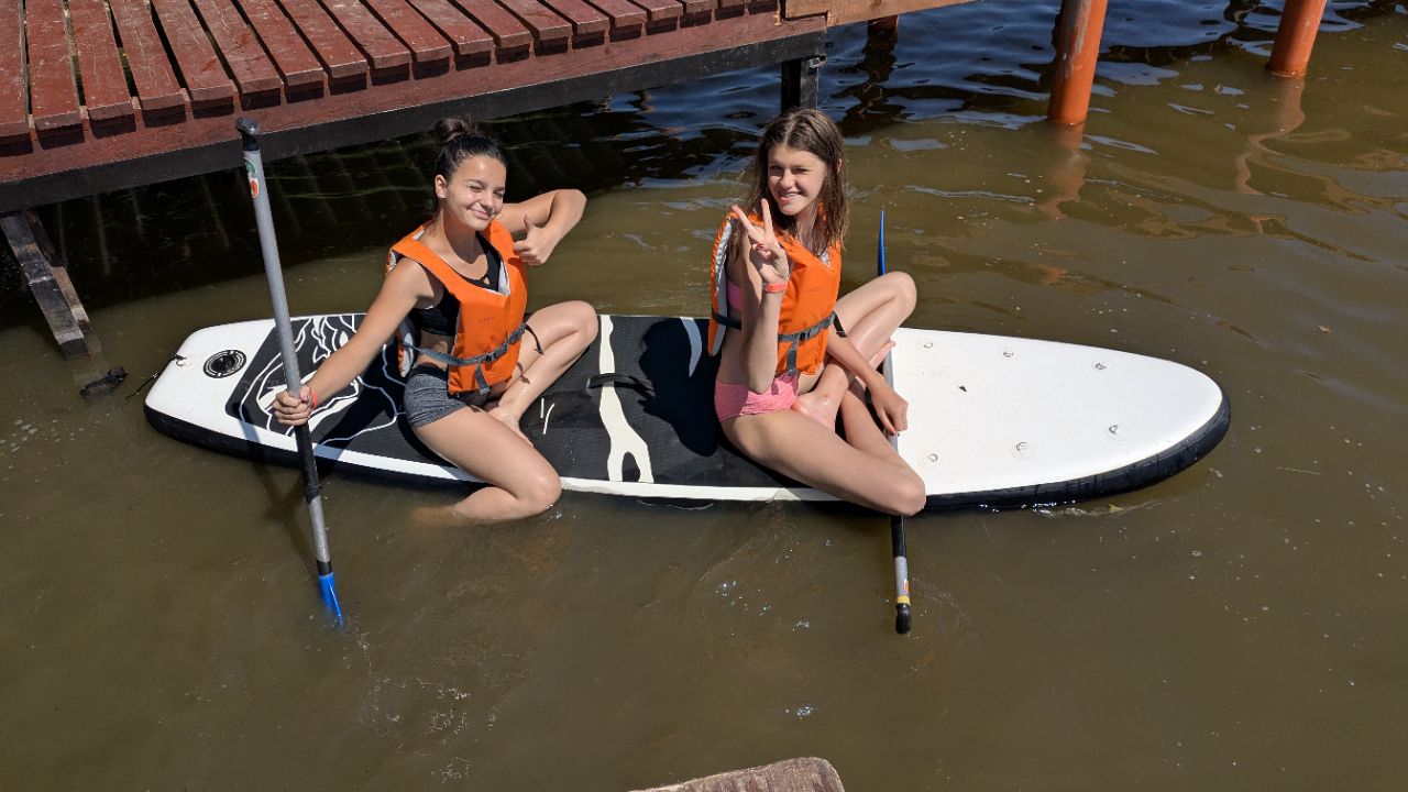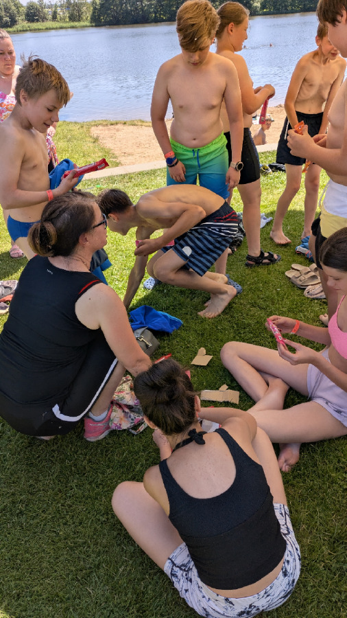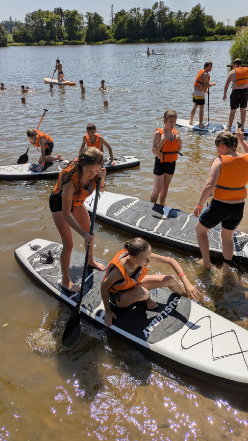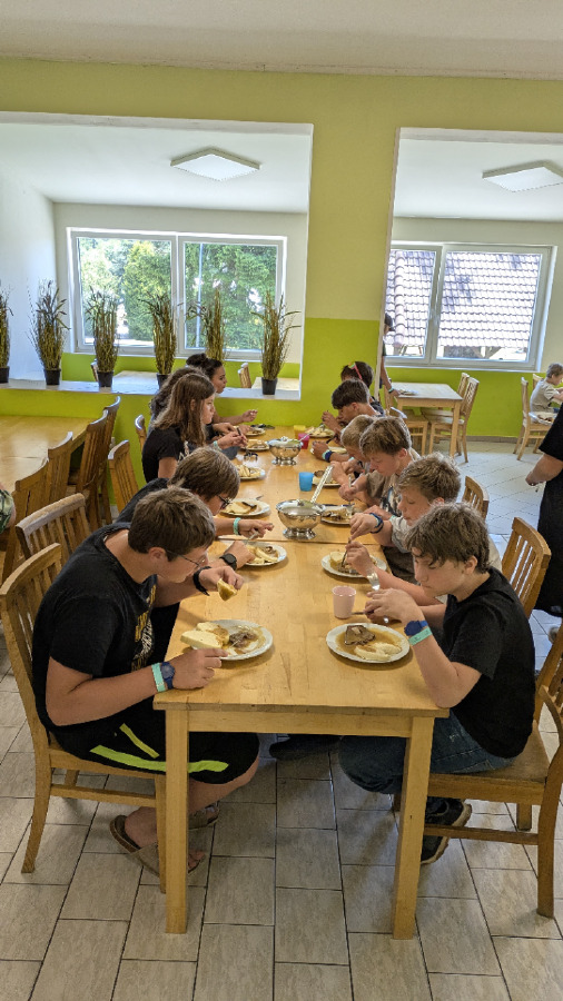 Od soboty do pondělí si naši sedmáci užili nezapomenutelný školní výlet v krásném areálu ve Zbraslavicích. Počasí nám přálo, po celé tři dny panovalo nádherné, horké a slunečné počasí, které přímo vybízelo k vodním radovánkám a pohybu na čerstvém vzduchu. Děti se s chutí koupaly v rybníce a vyzkoušely si i jízdu na paddleboardech, na kterých během pobytu udělaly velké pokroky. V areálu nechyběly ani trampolíny, kde se sedmáci doslova vydováděli. V sobotu nás svou návštěvou potěšila paní učitelka Volšová, která nám v parném dni přivezla osvěžení v podobě nanuků. Navečer se po zápase ve volejbale na chvíli objevila také paní učitelka Česalová, která neváhala a hned předala dětem své hráčské zkušenosti. Pozdravit nás přijela i paní učitelka Hájková. Večer jsme si společně užili u ohně. Opékali jsme buřty a o hudební doprovod se postarala dcera paní asistentky, která hrála a zpívala jak táborákové, tak moderní písničky, a tak jsme si všichni s chutí zazpívali. Jídlo bylo výborné – v kuchyni se o nás skvěle postarali a pochutnali jsme si například na svíčkové, řízku nebo špagetách. V tom horku jsme si také udělali výlet do nedalekých Štipoklas na zmrzlinu, která všem přišla vhod. U večerního ohně jsme se pobavili při kolektivní hře, kterou připravila paní učitelka Balanová. Zapojil se úplně každý a nechyběl ani kmenový tanec, při kterém se všichni do sytosti nasmáli a zatancovali si. Výlet jsme si naplno užili a přivezli si spoustu zážitků, na které budeme ještě dlouho vzpomínat.